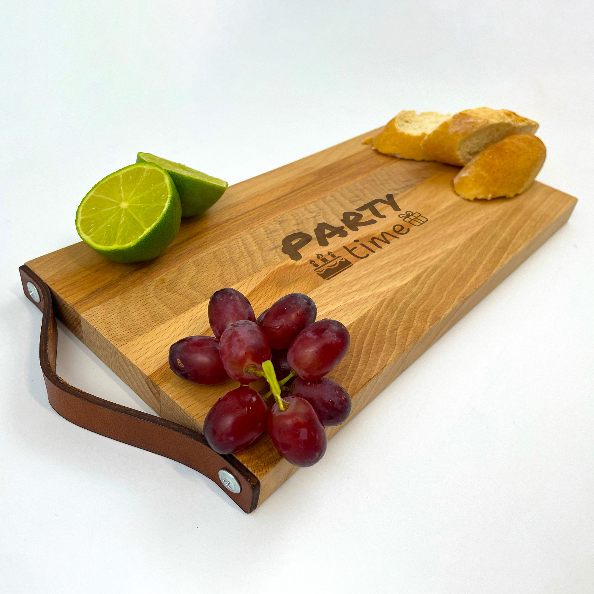 Schneidebrett mit Gravur | Ledergriff | Buche 33,5 x 16 cm