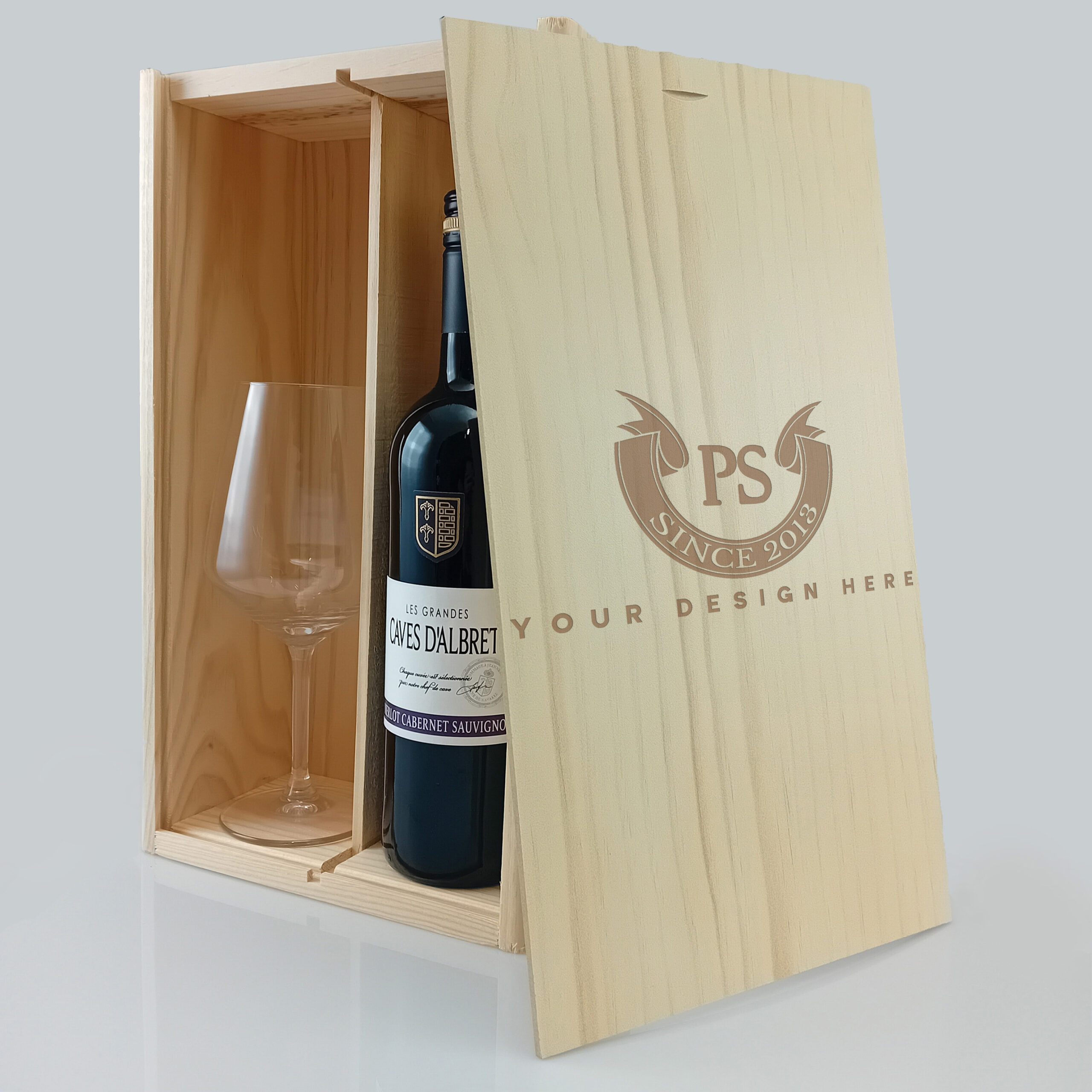 Wählen Sie dieses Weinpaket mit eingraviertem großen Weinglas für das perfekte, einzigartige Geschenk. Diese Weinkiste hat 2 Fächer und ist aus fein verarbeitetem Holz mit einem Schiebedeckel und Daumenloch. Innenmaße: 340x192x95 mm. Die Gravur auf dem Holz ist braun und die Gravur auf dem Glas ist weiß. Das große, rote Weinglas hat ein Fassungsvermögen von 530 ml. Wenn Sie es wünschen, können Sie unten auf dieser Seite eine rote Weinflasche auswählen, die wir mit einer Schicht Holzwolle in die Kiste legen werden.